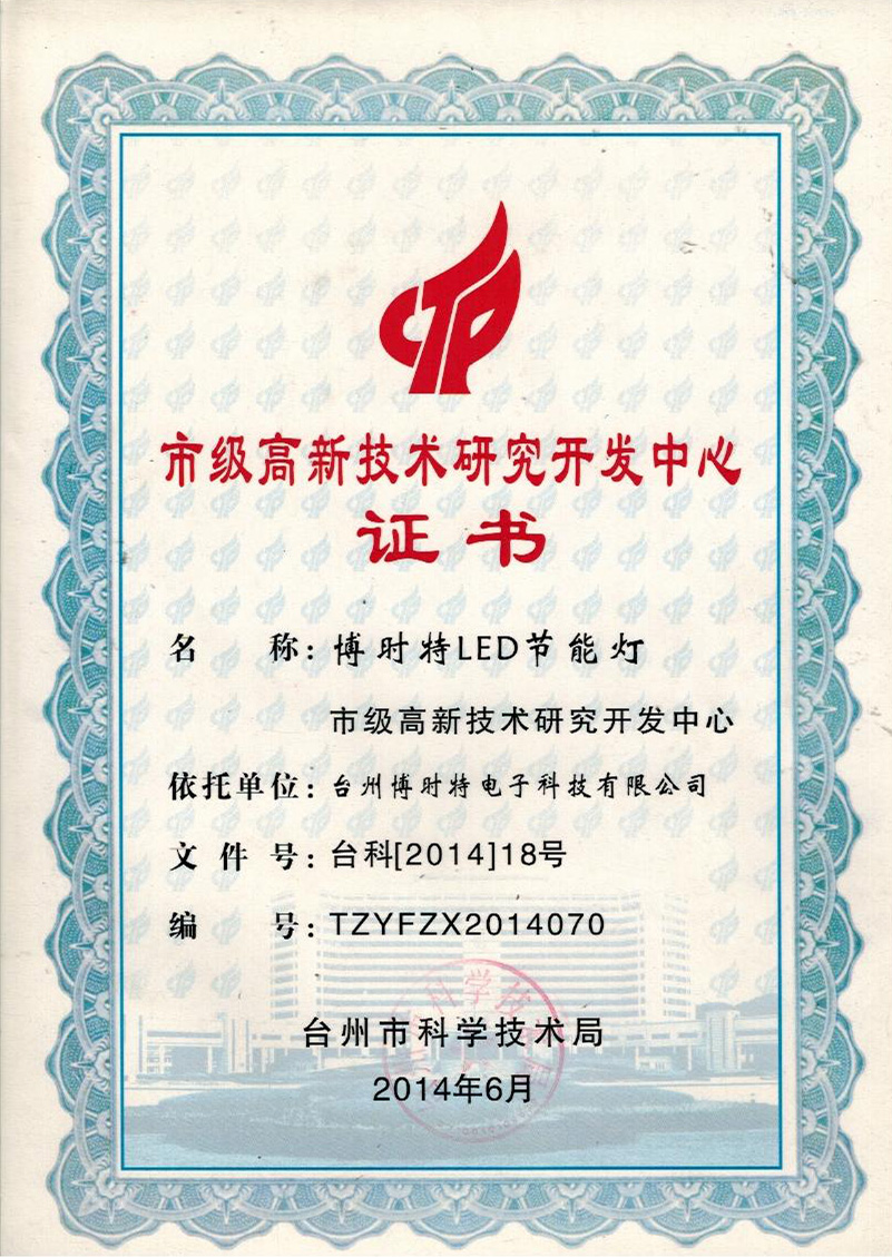 市級高新技術(shù)研究開(kāi)發(fā)中心證書(shū)